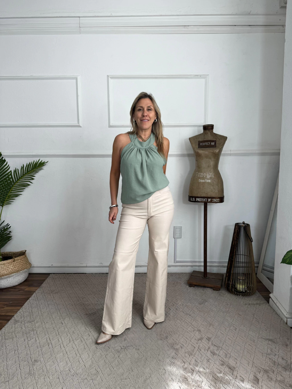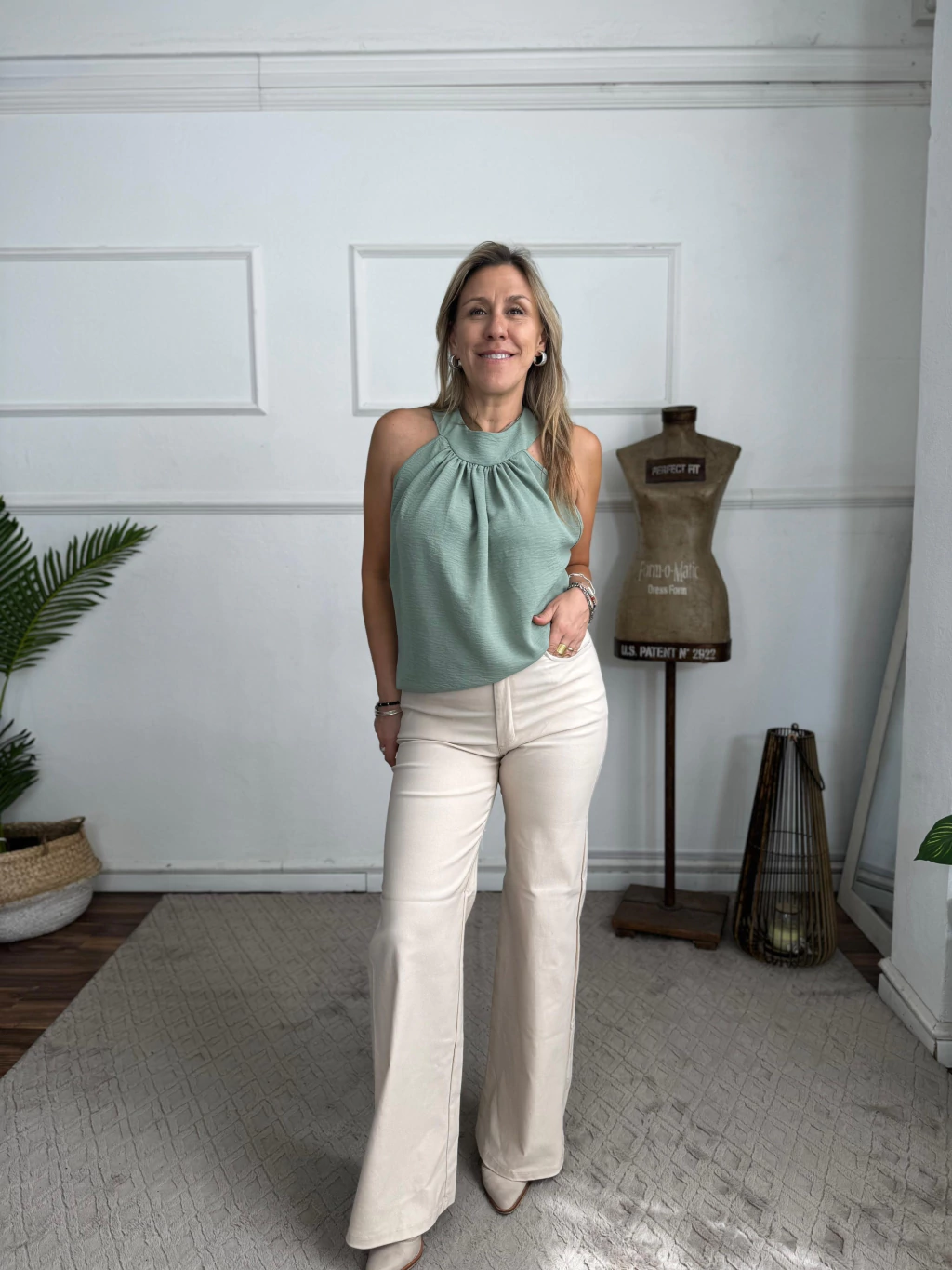 Su escote americano o halter realza tu figura de manera delicada, mientras que el corte evasé añade un movimiento fluido y femenino que te acompañará durante todo el día. La finura de su confección y el diseño cuidado hacen que esta blusa sea una pieza imprescindible para armar outfits elegantes y modernos.