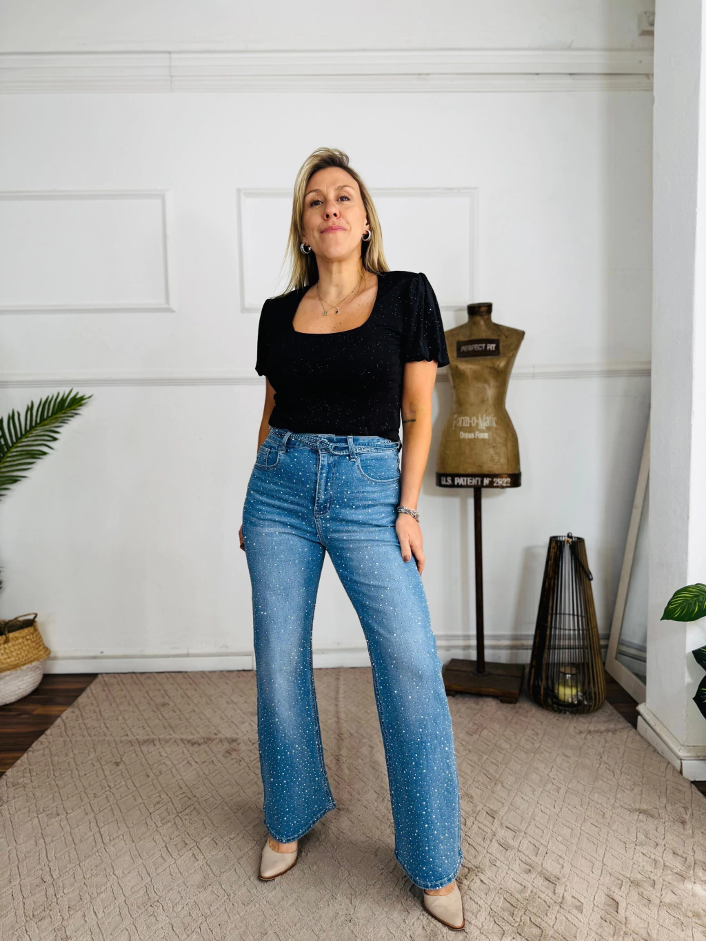 Lo que realmente lo convierte en una pieza única es el detalle de brillos que recorren todo el frente, aportando un toque de glamour irresistible. Además, viene acompañado de un cinto de jean con brillos, que realza aún más su carácter sofisticado y super canchero.