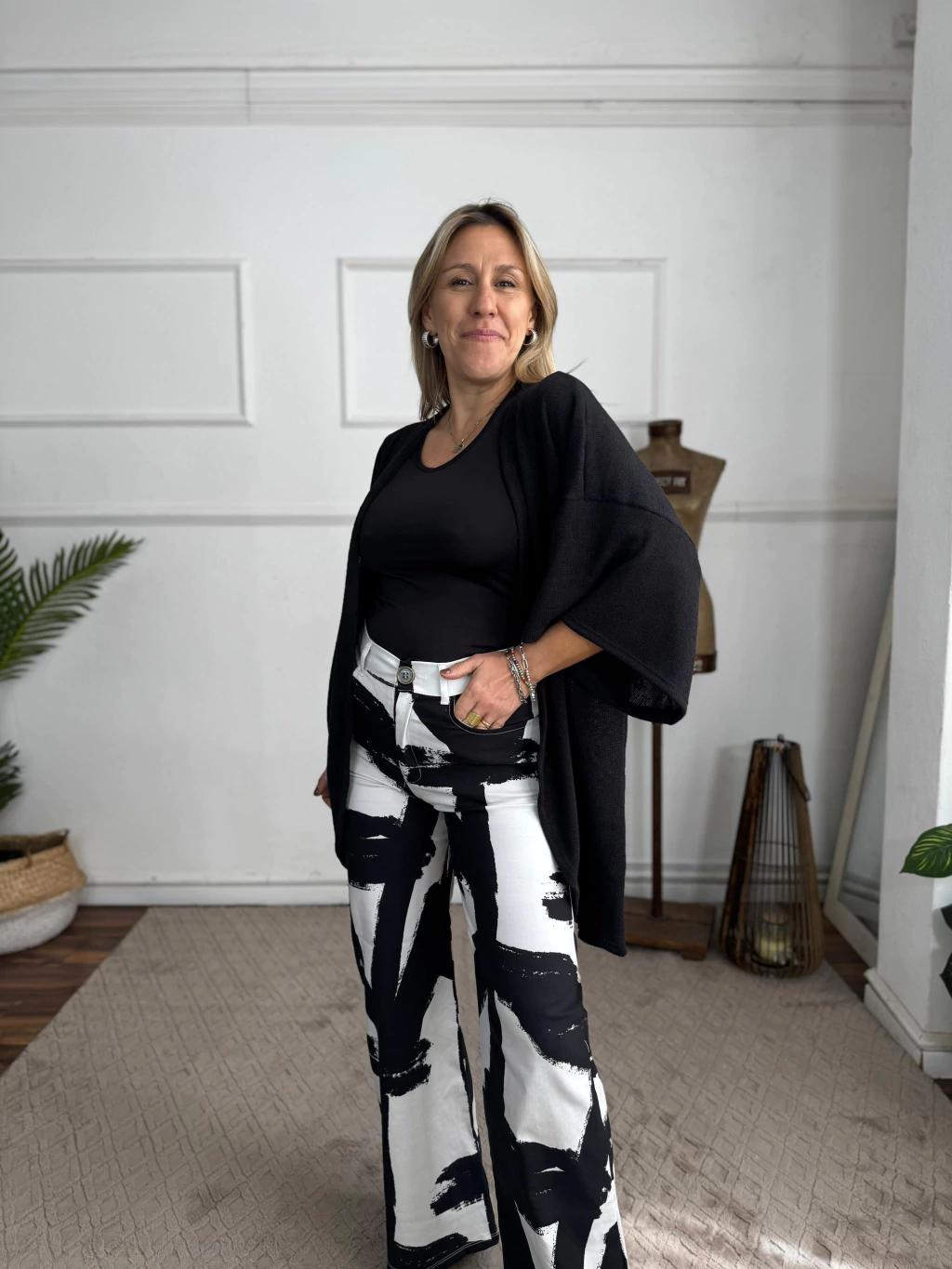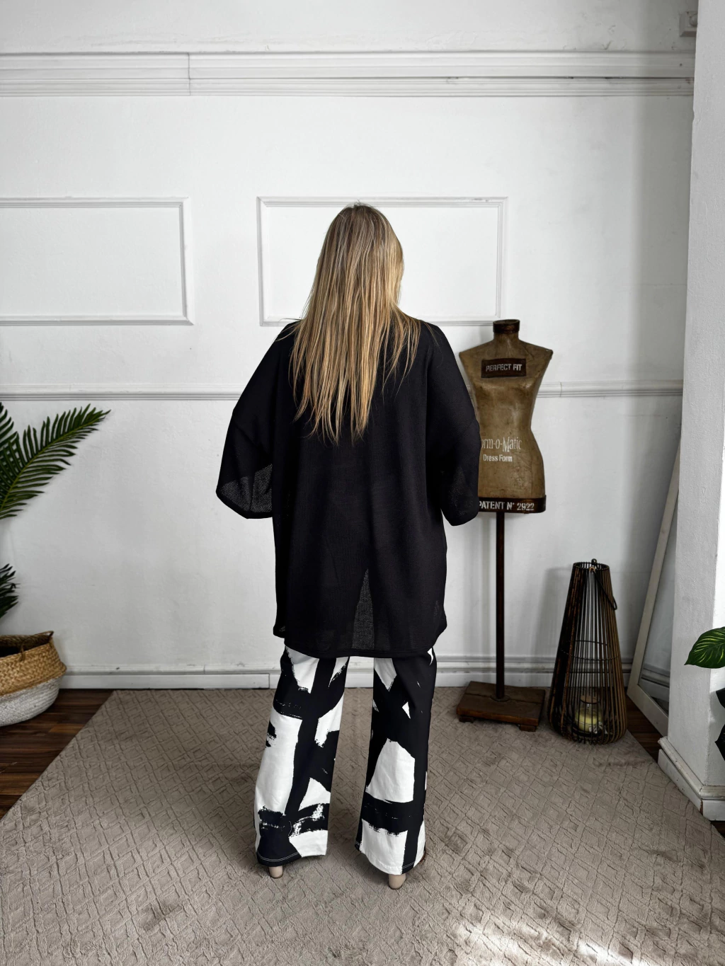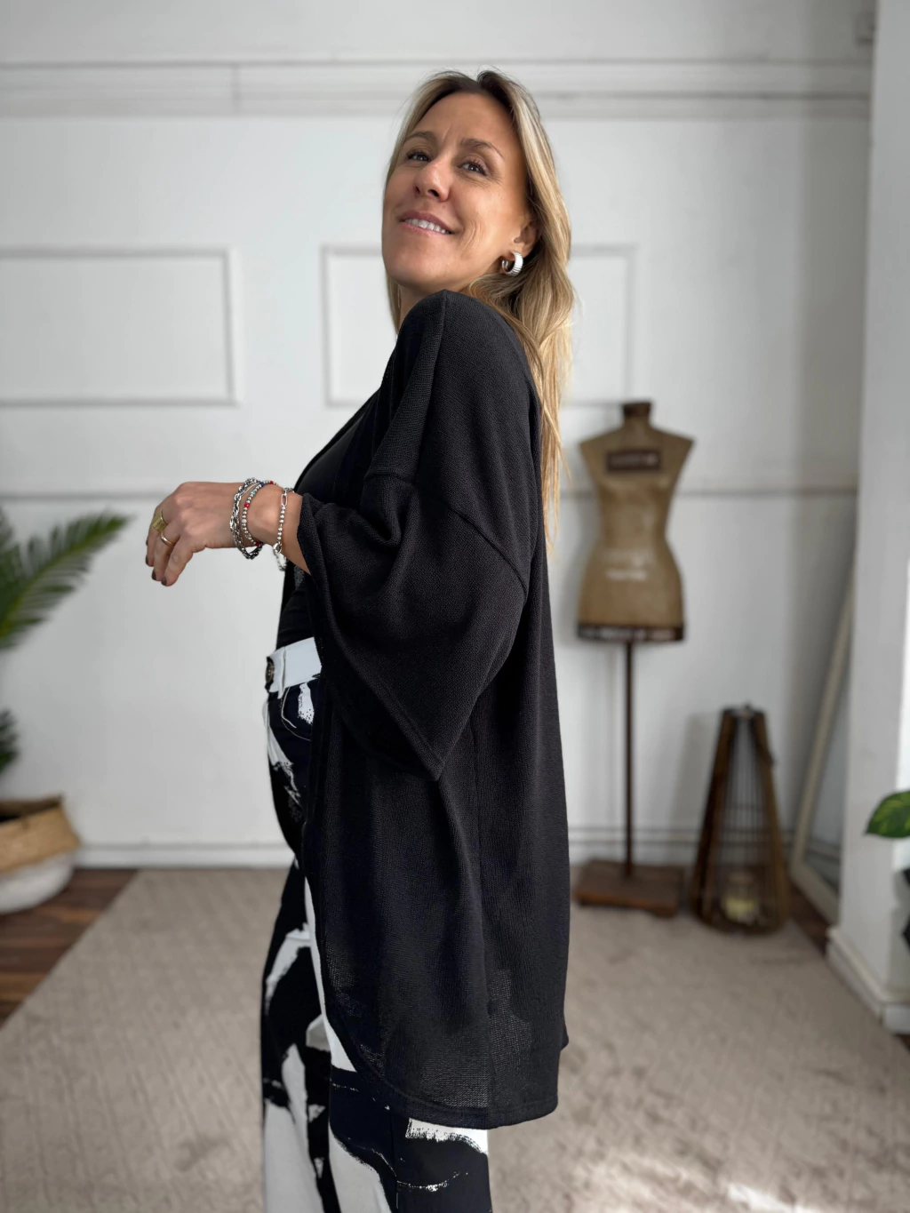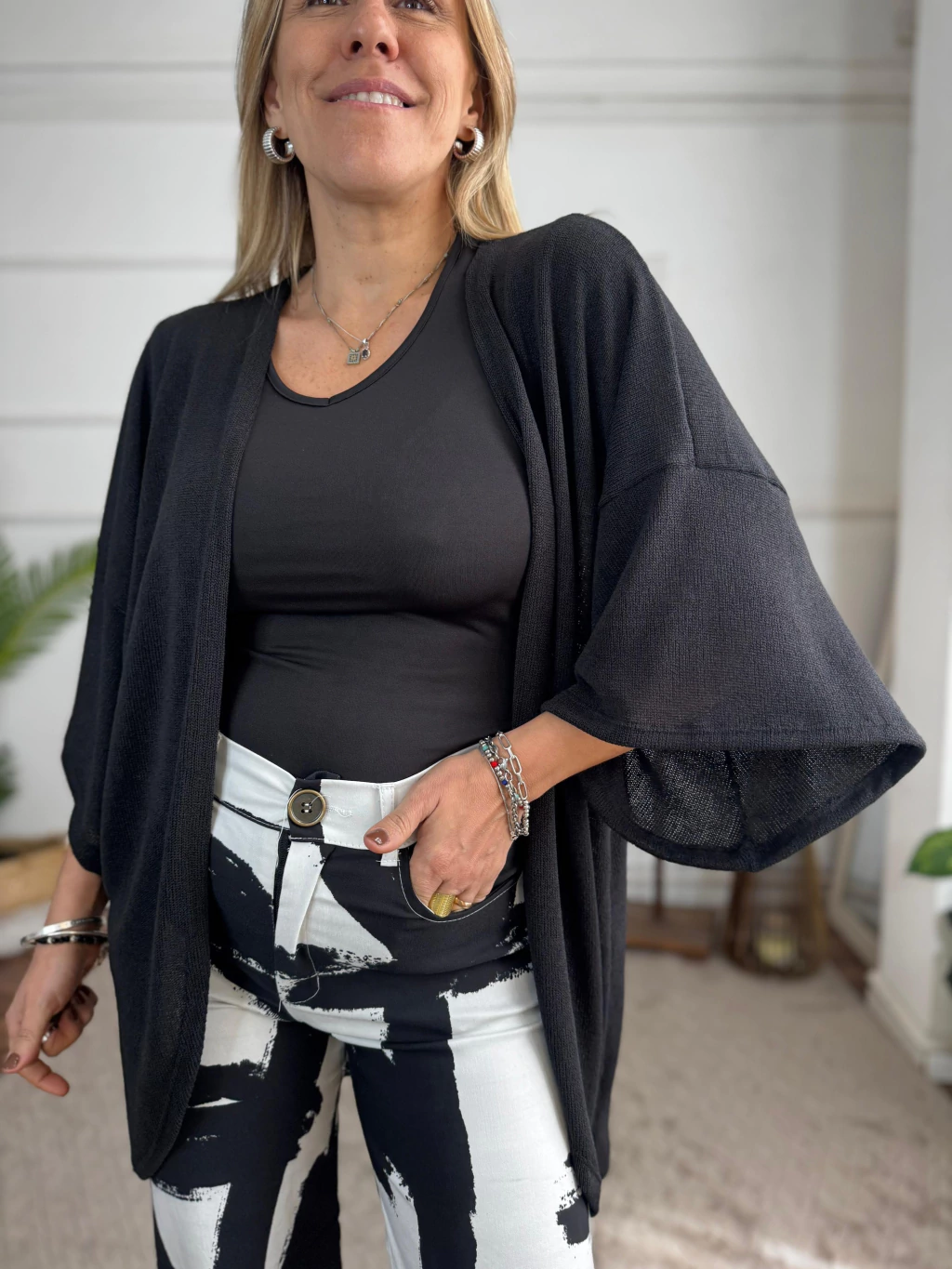 Su diseño con mangas cortas y corte redondeado aporta un toque de elegancia casual, perfecto para llevar como tercer prenda en el día a día o sobre la malla en la playa o la piscina. Versátil y moderno, el Kimono Tafí es la prenda que transforma cualquier look básico en un outfit sofisticado y relajado.