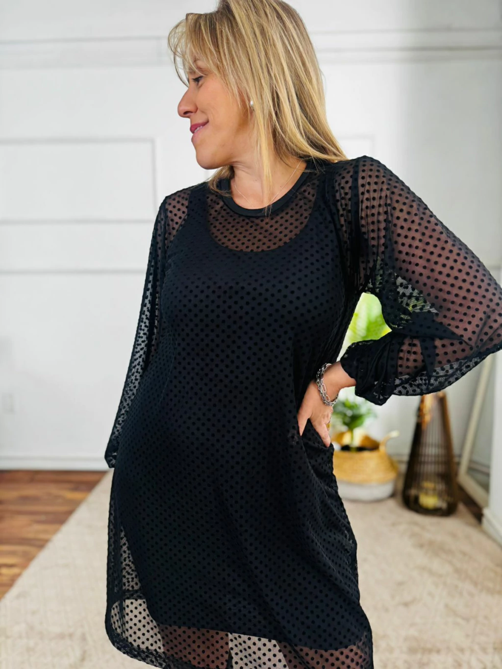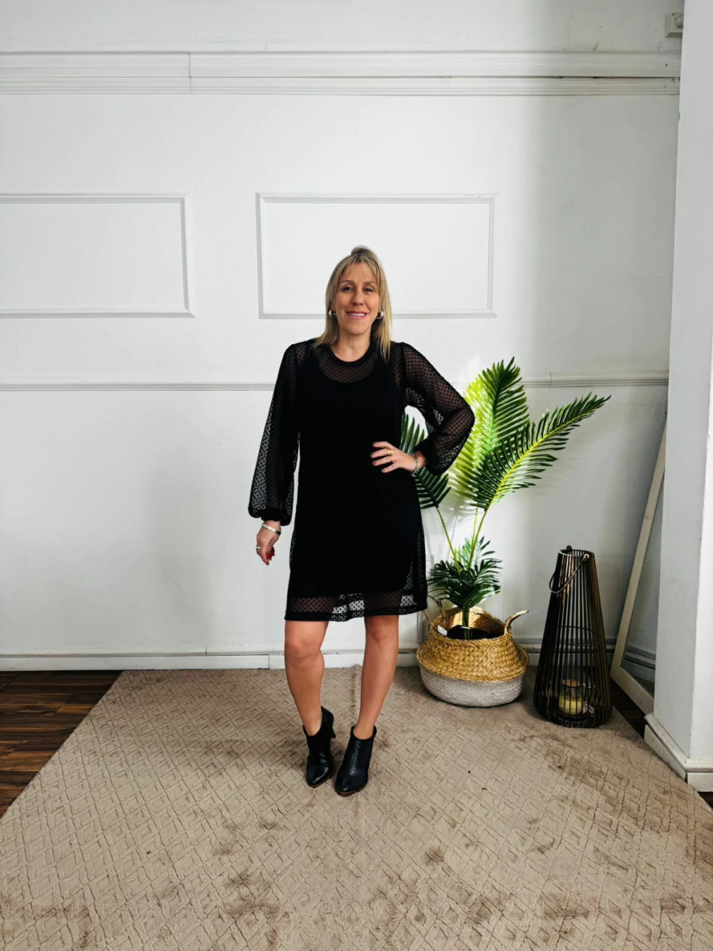 El Vestido Leysa tul, una pieza que combina elegancia y un toque sexy con la delicadeza del tul transparente. Confeccionado en un fino tul con estampado de lunares y corte evasé, este vestido destaca por su diseño de manga larga con elástico que aporta volumen y sofisticación a tu look.