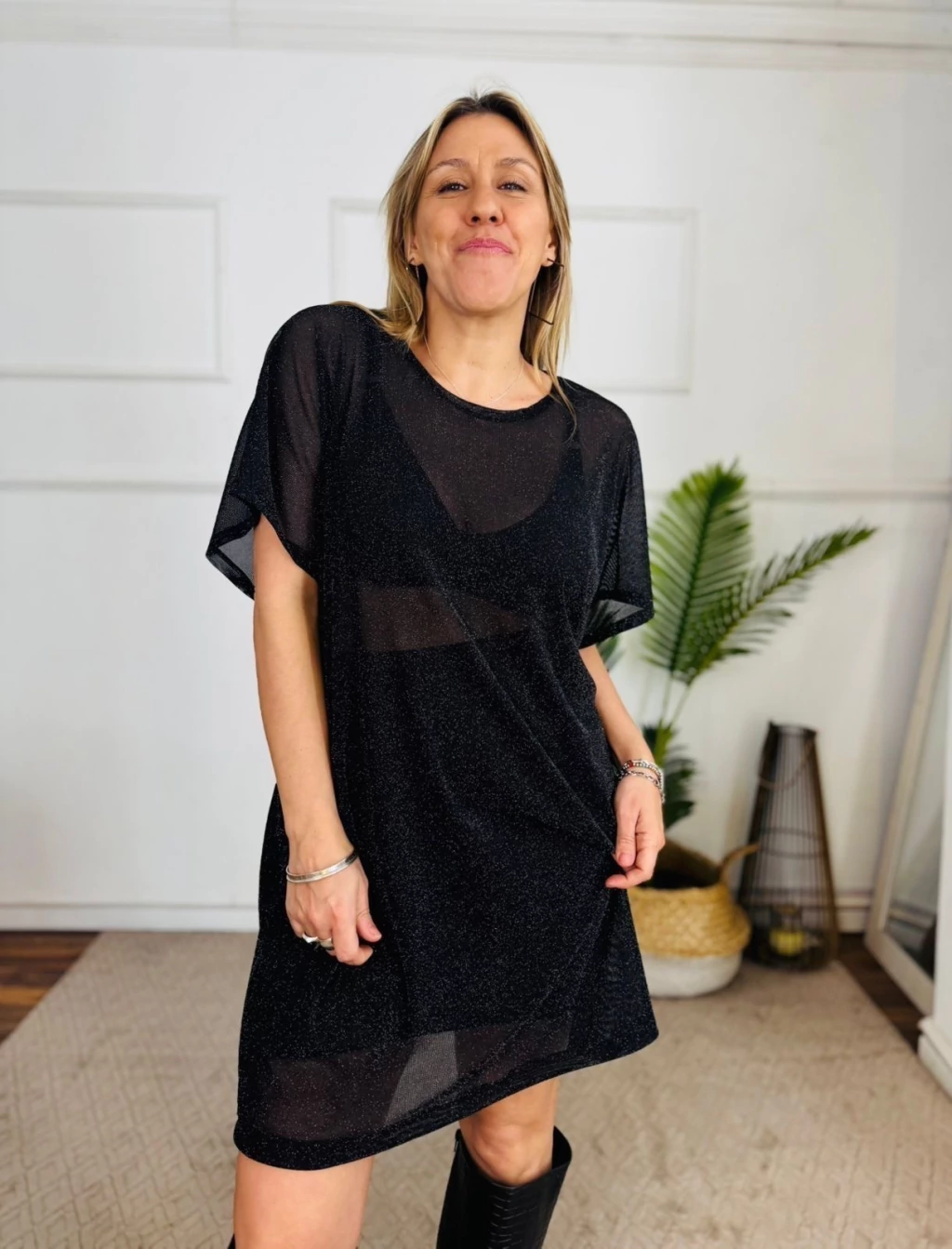 Descubrí el encanto del Vestido Maddy tul, una prenda confeccionada en microtul con delicados detalles de brillos que aportan un toque de sofisticación y glamour. Su diseño transparente lo convierte en la opción ideal para combinar con el Vestido Félix o la Pollera Alina, creando outfits elegantes y perfectos para ocasiones especiales.