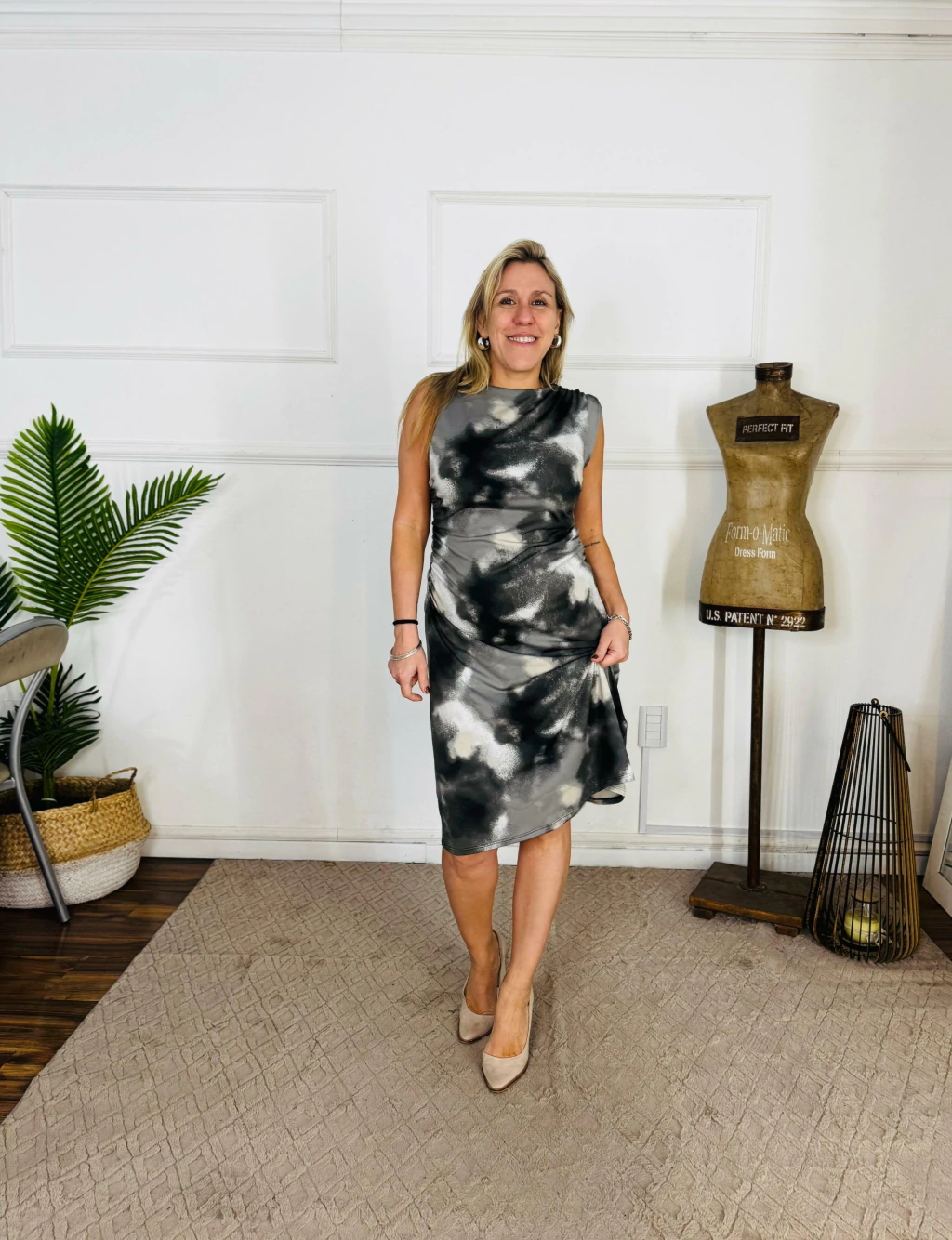 El diseño incorpora un sutil drapeado en la cintura, que aporta un ajuste perfecto y una silueta armoniosa, creando un equilibrio entre modernidad y clasicismo. La combinación de colores blanco y negro lo convierte en una opción versátil y atemporal, perfecta para acompañarte en momentos especiales donde quieras irradiar confianza y estilo.